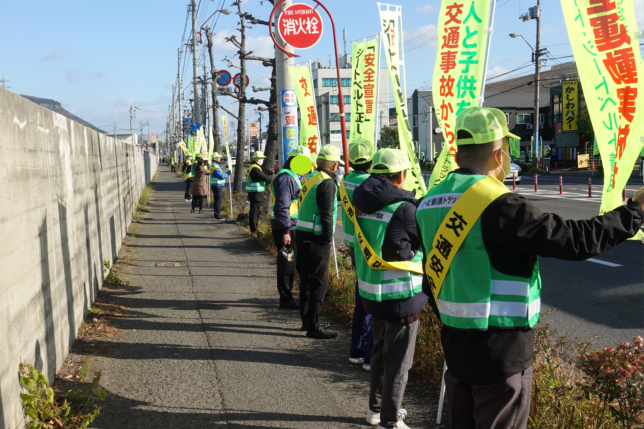 冬の肌寒さを感じる午後、約50名の協会員が交通安全を呼びかける横断幕や幟、プラカードを掲げてさぬき浜街道の道路沿いに立ち、道路を走行する一般ドライバーの方々に交通事故防止に対する意識啓蒙を図りました。